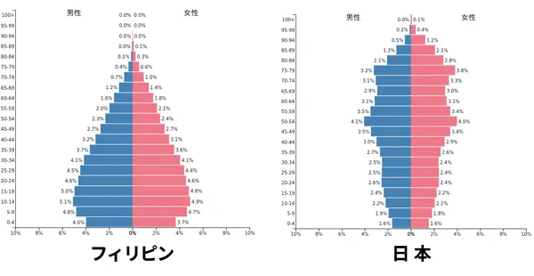 人口は2025年時点で、約1億1,600万人となっています。特に若者の人口が多く、人口ピラミッドは綺麗な三角形の形をしています。日本と比較すると、フィリピンの若者人口の多さを実感していただけるのではないでしょうか。