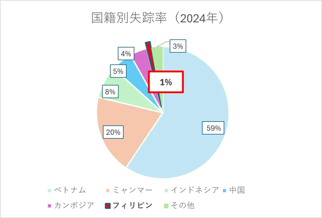 フィリピン人技能実習生の最大の特徴は失踪率が低いということでしょう。2025年6月末時点で、フィリピン人は技能実習生全体の9%を占めており、国別では第3位です。しかし失踪者の割合は、2024年のデータでは全体の約1%と、かなり低い数字となっています。