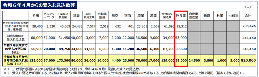2024年3月末時点の閣議決定では、5年後の2029年までの受け入れ見込み数は「53,000人」と設定されていました。